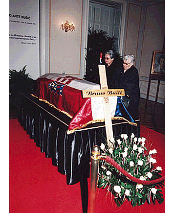 Ja, skoro prosjak, duh slobode širim, Pa ma i nemo na svom grobu svijeću, Ja neću, neću, neću da se smirim. Ko svježi vjetar u sparinu pirim, A kada umor svlada duše lijene, Na otpor trubim ja, trubač sa Seine! U grobu s njim ležao je kamen iz Hrvatske, s torbom na kojoj je bio hrvatski grb i cvijet majčine suzice. Kosti su mu prenesene u Hrvatsku i 16. listopada 1999. pokopane u Aleji branitelja na zagrebačkom Mirogoju.