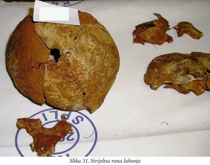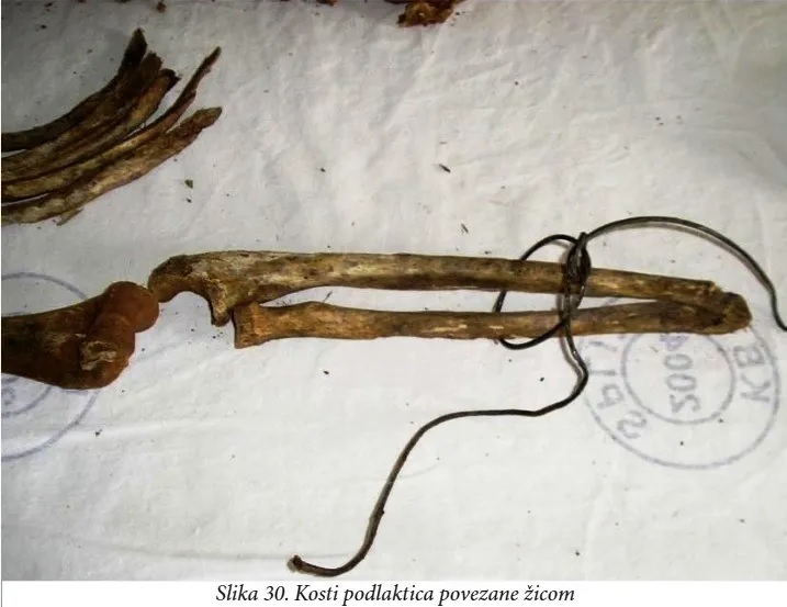 Pregledom ekshumiranih koštanih ostataka utvrđeno je da pripadaju osamnaestorici odraslih muških osoba. Kosti podlaktica šest osoba bile su povezane žicom. Na kostima jedanaest osoba utvrđene su strijelne rane. Kod desetorice se radi o strijelnim ranama glave, mahom u području tjemeno-zatiljnog ili zatiljnog dijela glave dok je jedna osoba imala strijelnu ranu natkoljenične kosti. Četiri osobe imale su po dvije strijelne rane (jedna dvije strijelne rane glave, jedna strijelnu ranu glave i zdjelice, a dvije strijelnu ranu glave i udova). Uz kosti nađeni su i predmeti, uglavnom puce i komadići tkanine, te kod jedne osobe tri zrna streljiva i donji dio žlice.