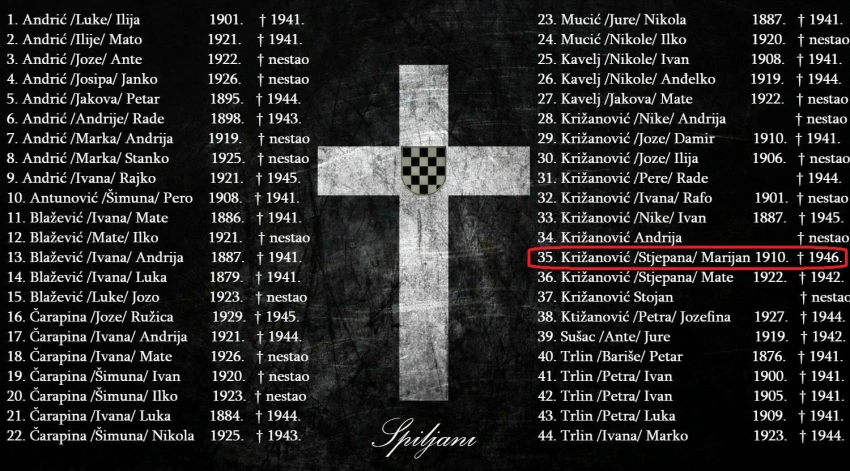 Samo u Spiljanima ubijena su 44 Hrvata imenom i prezimenom. Bilješka o stradanju Hrvata Spiljana nalazi se i u knjizi fra Martina Planinića “Tko je izdao Kavrana”. Tekst je sljedeće sadržine: